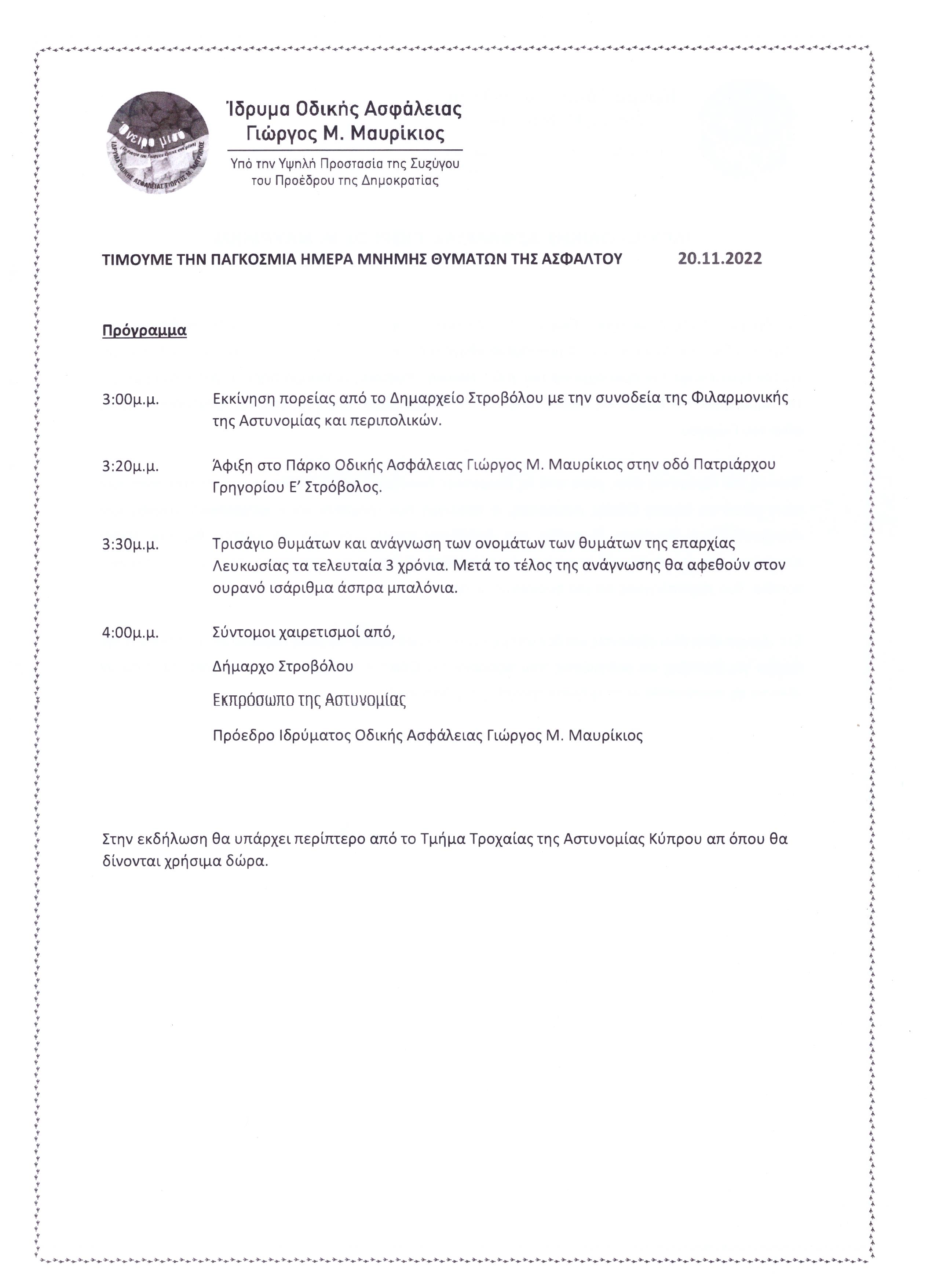 Έχω οδηγίες να αναφερθώ στο πιο πάνω θέμα και να σας ενημερώσω ότι στο πλαίσιο της Παγκόσμιας ημέρας μνήμης για τα θύματα των τροχαίων δυστυχημάτων, η οποία τιμάται κάθε χρόνο την τρίτη Κυριακή Νοεμβρίου, το Ίδρυμα Οδικής Ασφάλειας Γιώργος Μ. Μαυρίκιος θα πραγματοποιήσει εκδήλωση την Κυριακή, 20 Νοεμβρίου 2022 και ώρα 3:00 μ.μ., στο Πάρκο Οδικής Ασφάλειας Γιώργος Μ. Μαυρίκιος στην οδό Πατριάρχου Γρηγορίου Ε' στον Στρόβολο. Το πρόγραμμα της εκδήλωσης επισυνάπτεται.